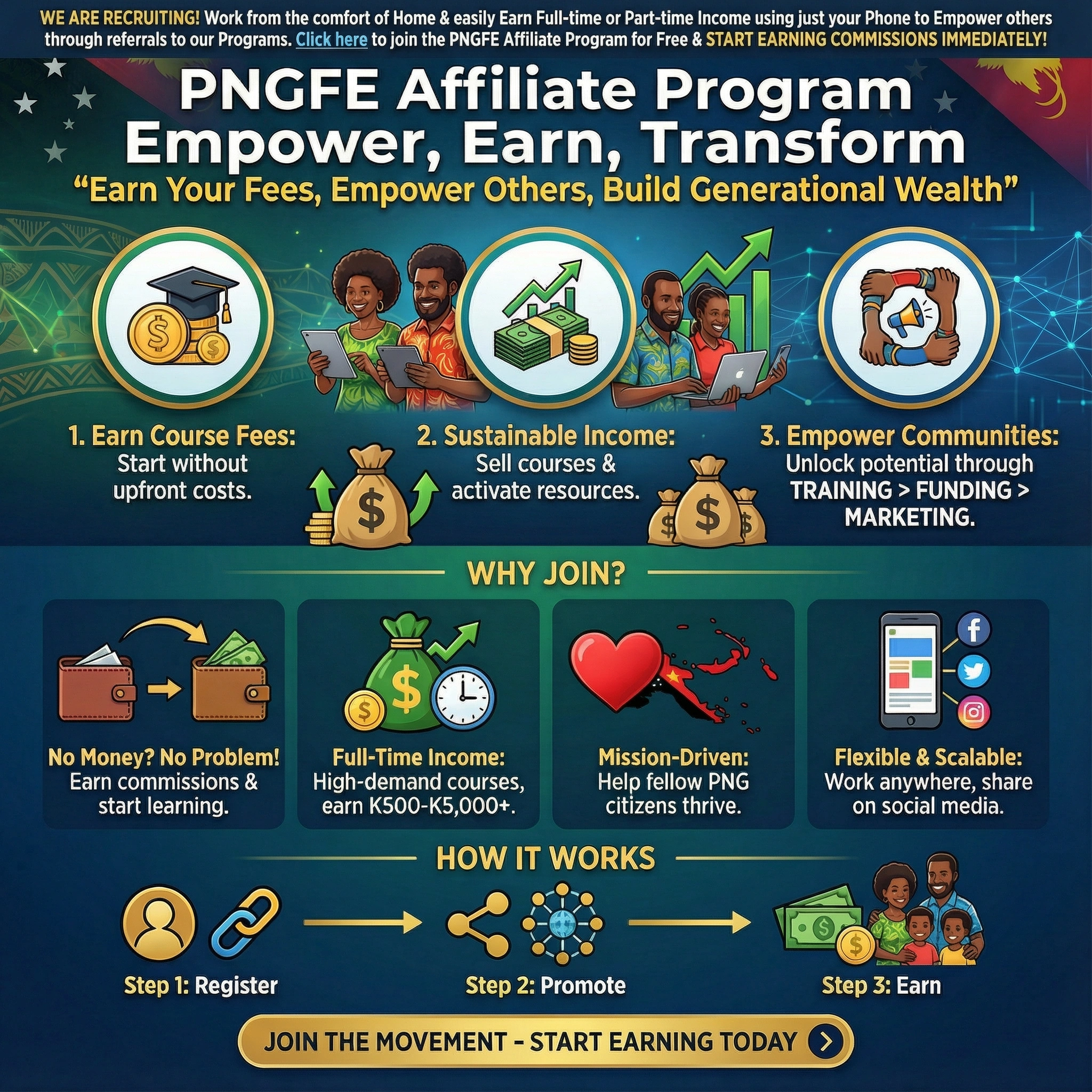 High-demand courses, family-focused business training, and natural resource activation make PNGFE courses easy to promote. Top affiliates earn K500โK5,000+ per month, depending on reach and effort.